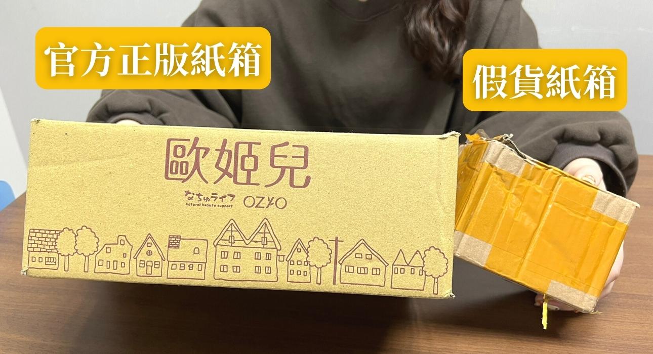 1. 外箱:正版紙箱印有「歐姬兒」官方Logo,假貨紙箱粗製濫造。